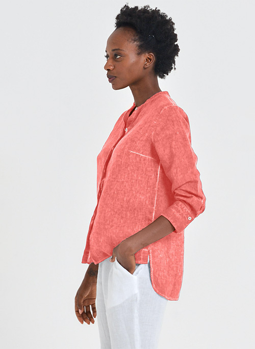 Breezy linen shirt featuring a banded collar with front button closures and a regular fit.