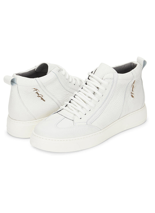 Our premium 18's high-top sneakers are handcrafted in pure white garda leather. Popular for their ability to adapt to any season or personal style, our 18 Collection features padded and removable footbeds, adjustable laces, and treaded rubber soles for excellent traction. A must-have with a casual vibe, our high sneaker is designed in New York City and precisely stitched by skilled artisans in Brazil.