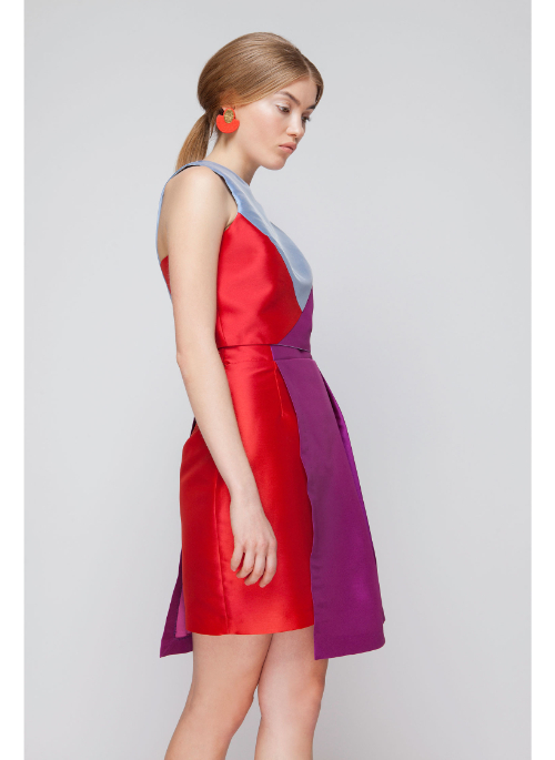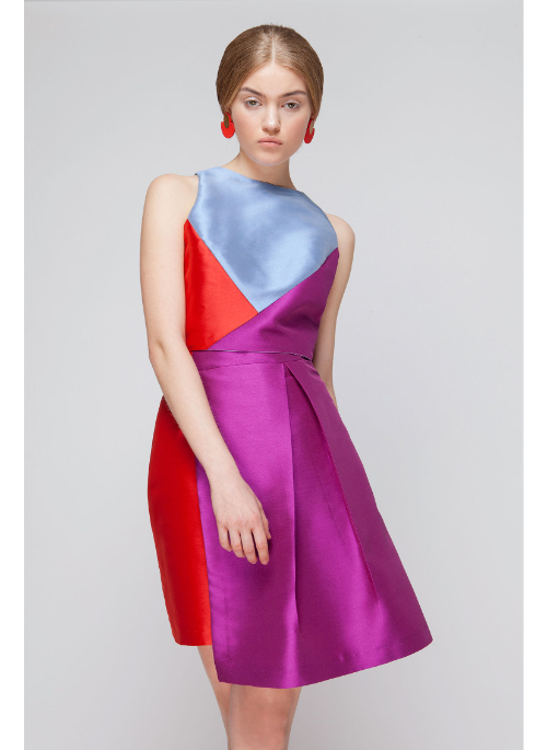 Bold colours and geometric design seem like natural partners on this playful cropped top. A cropped top constructed with an asymmetrical geometric colorblock pattern on mind from a luxe shiny duchess satin fabric. It features a slim fit and a metal zipper in the back. Fully lined with cotton lining.