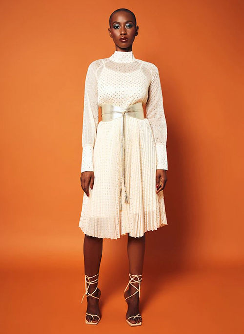 Whimsical Plissé Chiffon Dress with a leather gold belt.