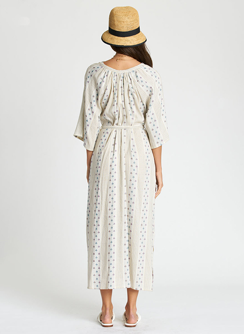 This relaxed, Acapulco dress, with its wide, elbow sleeves and hidden placket, also features a removable sash belt. Cut in ivory-printed cotton, this midi-length silhouette, is a chic, casual piece with soft, summer undertones.