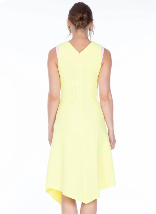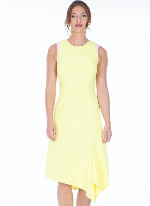 Our latest dress Adelle, is designed in a fit and flare silhouette. It falls beautifully into an asymmetric hem line, featuring contrasting colour panels on the shoulder.