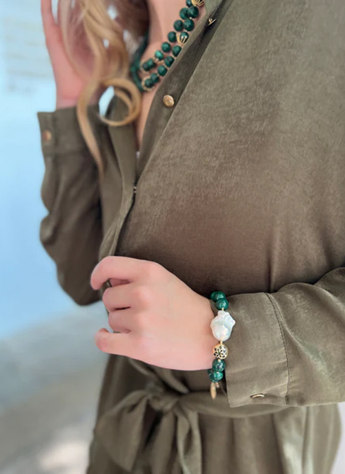 This handmade bracelet is made of malachite with baroque pearl with Japan golden plated brass findings. This bracelet is adjustable which can be pair with Farra necklace and earrings to complete you look. Matching with denim, blouse or knitwear from day to night for any occasion. Also, this is a very lovely gift for birthday, anniversaries or festivals. It will be contained in a nice jewelry box with well packed.