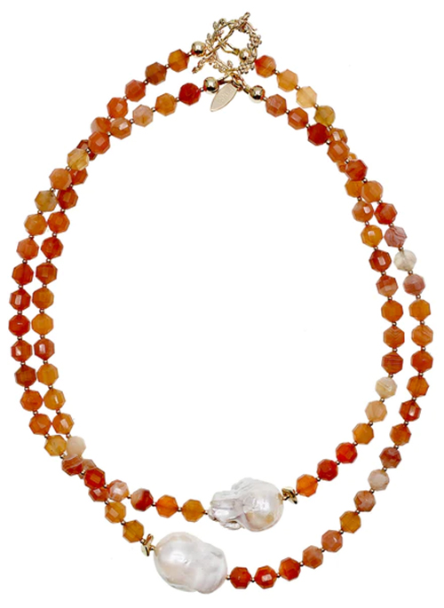 This handmade double strands necklace is made of orange agate with baroque pearl and Japan golden plated brass findings. It's inspired by nature which can be worn with dress, blouse or knitwear both looks stunning! Pair with Farra earrings with simple hair style to complete your look. Also, this is a very nice gift for birthday, anniversaries or festivals. It will be contained in a nice jewelry box with well packed.