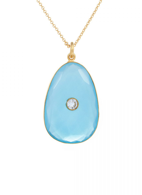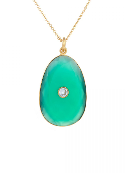 A timeless statement pendant makes a dramatic entrance – the large, tear-shaped gemstone – whether Black, Green or Red Onyx or Blue Chalcedony – is the perfect foil to a gold-plated encasing and the twinkling Cubic Zirconia in its centre. Work and evening wear elevated to a new level.