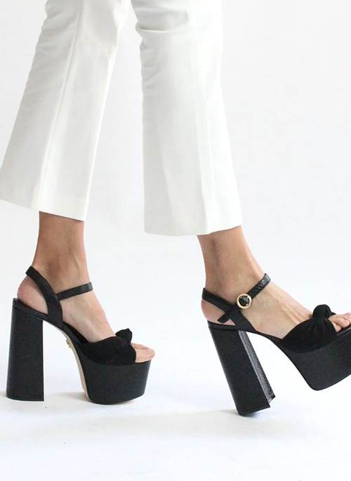 A new mega platform, our Ale model plays with a contrast of textures on its platform and heel, with the upper part created in a soft suede knot and ankle strap, which supports and provides all the comfort to the foot.