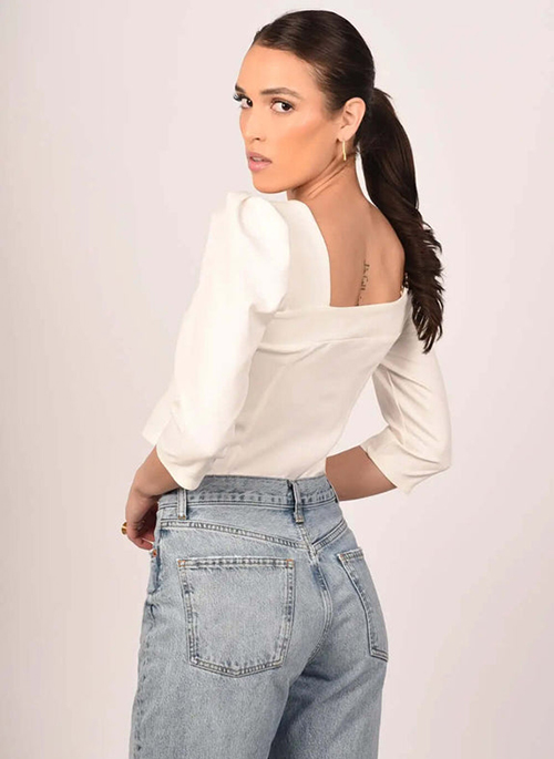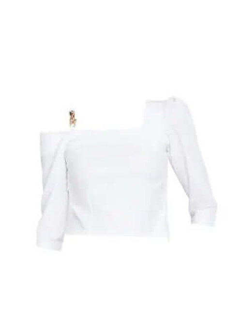 A tailored crop top with bishop sleeves and a Sabrina neckline. It features a wide strap at the hem with a sequined geometric motif. This solid top has a streamlined cut that will complement any fitted bottoms.