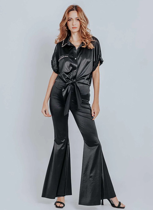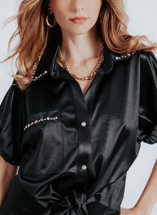 Keep it stylish with a Alice Tie Front Satin Shirt that creates a stunning impression! The Satin Shirt features a tie front with a Beaded attached details on collar. Complete look with Boot Cut Pants or Flare pants and high heels.