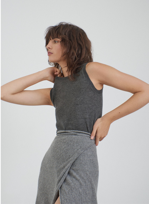 Sleeveless top knitted in impeccable soft extra fine cashmere from Inner Mongolia. Round neck with rolled edges. Fitted across the shoulders. Stretch fit for a second skin feel.