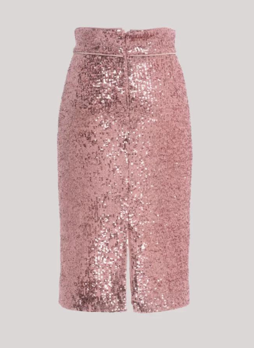Midi pencil skirt with high waist and double central slit, both on the front and on the back. Embellished with the fashion piping detail on the tone-on-tone silk belt. The zip closure on the back is hidden. Made of fabric with pink micro sequins. Head designed and created entirely in Italy.