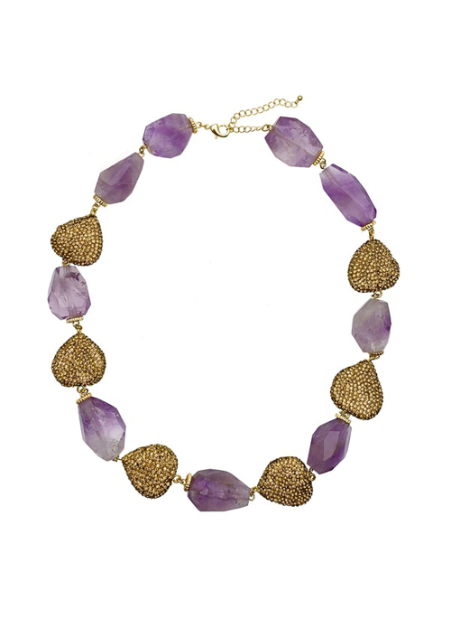 This brilliant necklace is made of natural amethyst with rhinestones and Japanese gold plated brass findings. It's beautiful and feminine. Match with a floral printed top, a dress, or knitwear. This necklace is perfect from day to night or for any occasion.