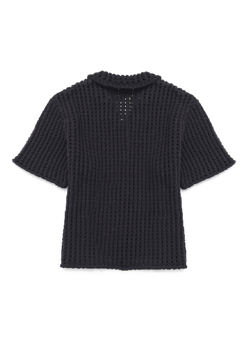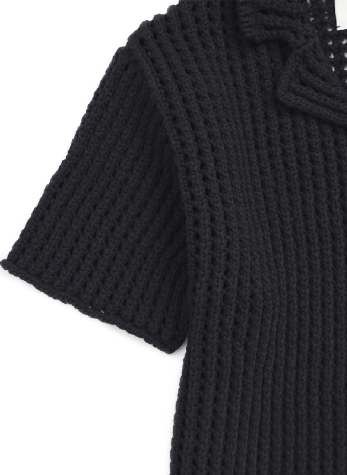 Open knit cardigan made of bland cotton yarn combined with matching pants. Short sleeve, relaxed fit collar detail and front bottoms to style open closed for a different style.
