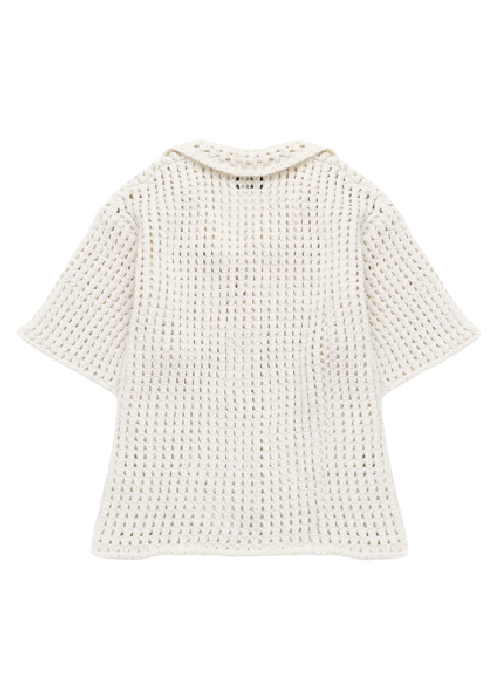 Open knit cardigan made of bland cotton yarn combined with matching pants. Short sleeve, relaxed fit collar detail and front bottoms to style open closed for a different style.