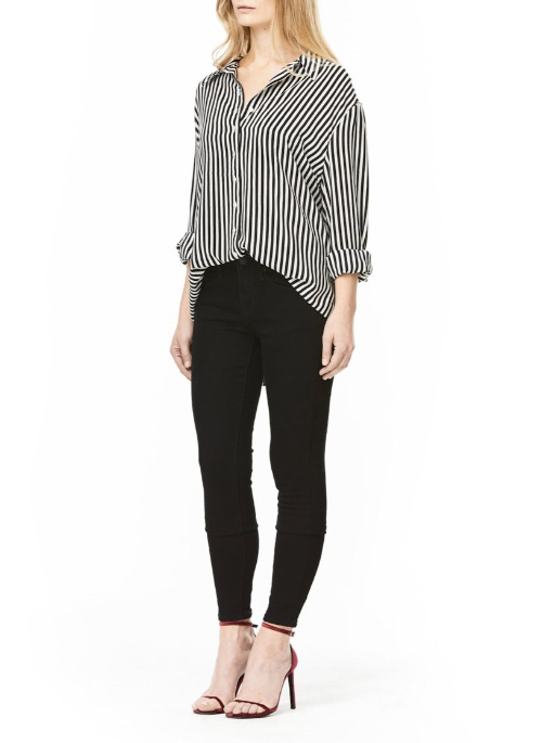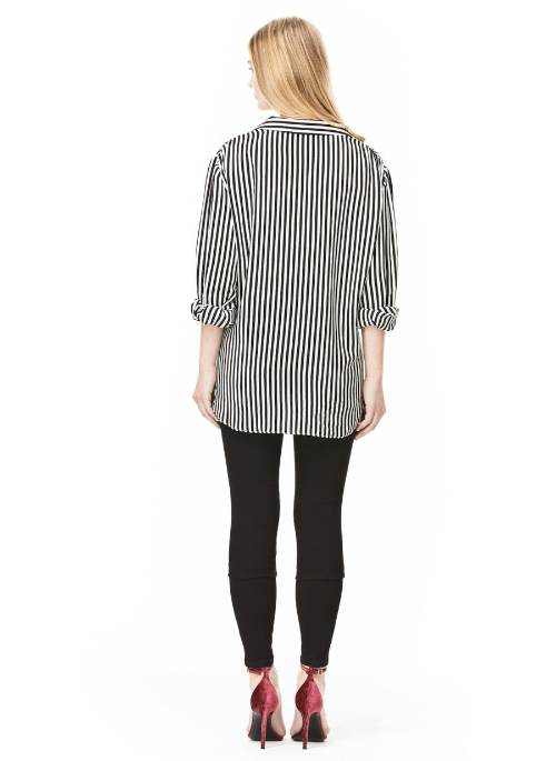 Every woman needs a perfect silk blouse in her closet. This is ours. Made from filmy black and white printed silk, Andrea has pleasantly full sleeves that end in a 2-inch cuff.