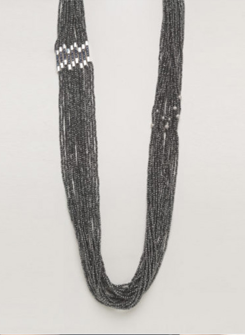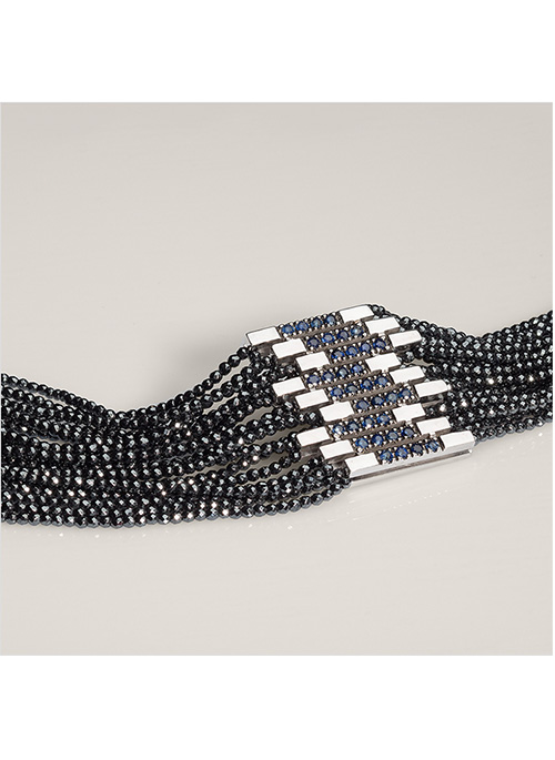 Eighteen rows of black hematite gemstones joined together by a Platinum plated 925 Sterling Silver clasp decorated with 36 sparkling Sapphires totaling 2.10 cts, this exquisite necklace will turn heads at every occasion.