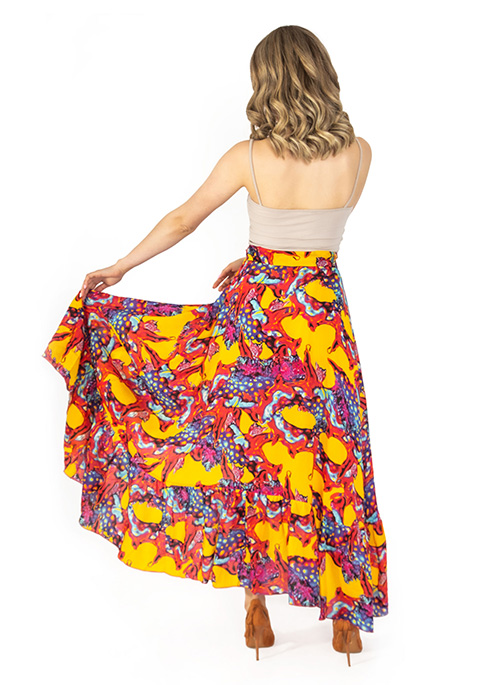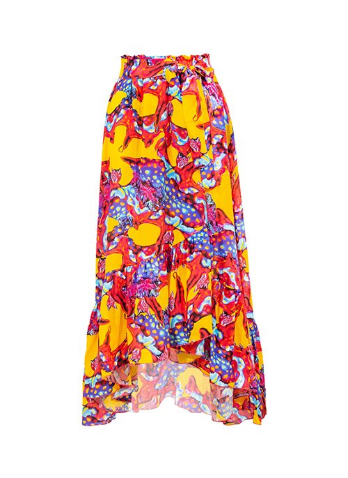 Summer asymmetrical skirt, slightly shorter at the front. Finished with frills with a belt that can be tied at the back or at the waist.