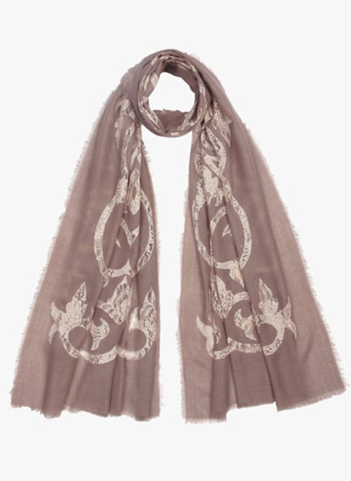 Woven from a fine cashmere wool, this delicate scarf boasts of an intricate handcrafted lace cutout application in a contrasting beige colour. An ornamental piece making for a chic and trendy accessory.