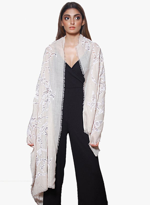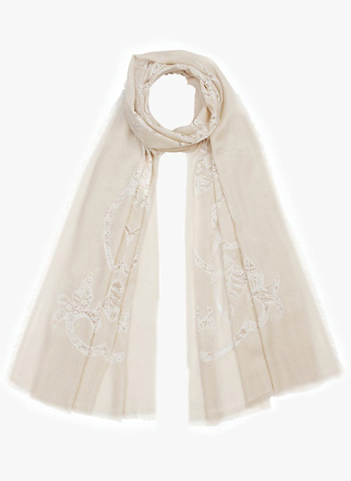 Woven from a fine cashmere wool, this delicate scarf boasts of an intricate handcrafted lace cutout application in a contrasting ivory colour. An ornamental piece making for a chic and trendy accessory.