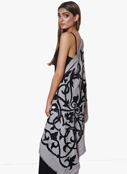Woven from a fine cashmere wool, this delicate scarf boasts of an intricate handcrafted lace cutout application in a contrasting black colour. An ornamental piece making for a chic and trendy accessory.