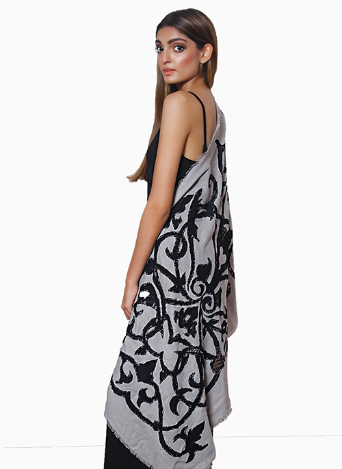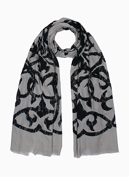 Woven from an incredibly fine cashmere wool, this delicate mousse scarf boasts of an intricate handcrafted lace cutout application in a contrasting black colour. An ornamental piece making for a chic and trendy accessory.