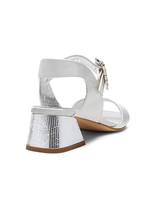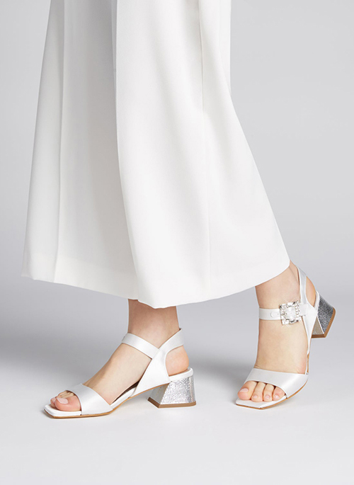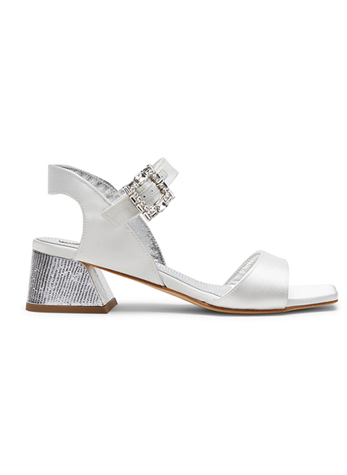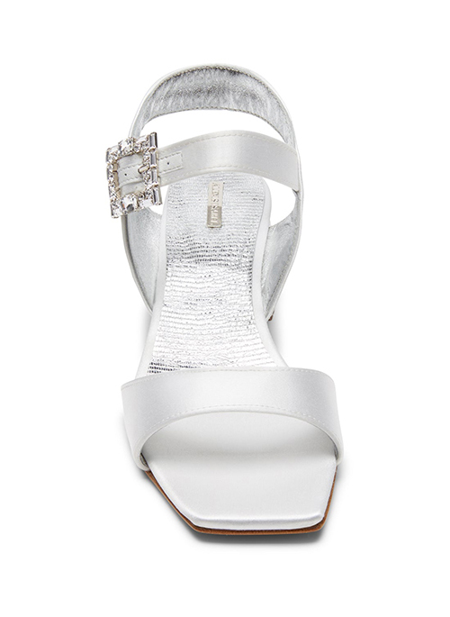 Go absolutely gaga for these ankle strap sandals with geometric heels. Made with silky white satin, these sandals are a must-have for any bride. Their open-toe design creates a flawless silhouette. Silver leather accents and a handcrafted crystal buckle elevates this shoe's style. This mid heel sandal offers the right amount of lift while being comfortable enough to wear all day. Makes a fantastic bridal, bridesmaid, or junior bridesmaid shoe.