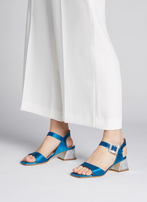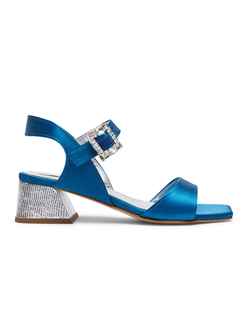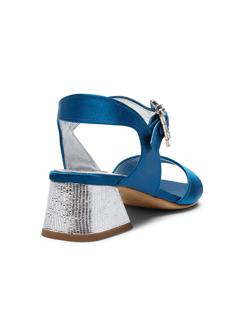 Sky-high heels need not apply! Up your chic factor in these blue indigo satin sandals. Their silver leather wrapped heel and artisanal crystal buckle make for a shimmering look. A supportive geometric heel makes this design modern and wearable from day to night. Perfect for brides in search of "something blue." Terrific for the mother-of-the-bride, bridesmaids, or junior bridesmaids as well.