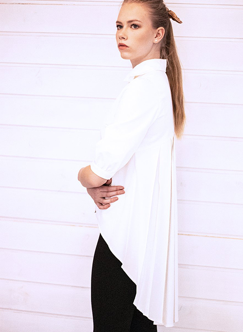 Unique white shirt with sewn pleats and KiRiVOO double collar. Made of 100% organic cotton fabric. Design: KiRiVOO by Ines Karu-Salo.