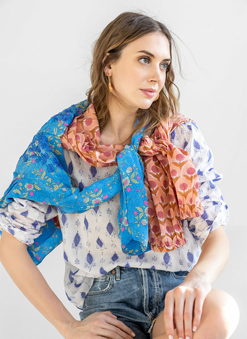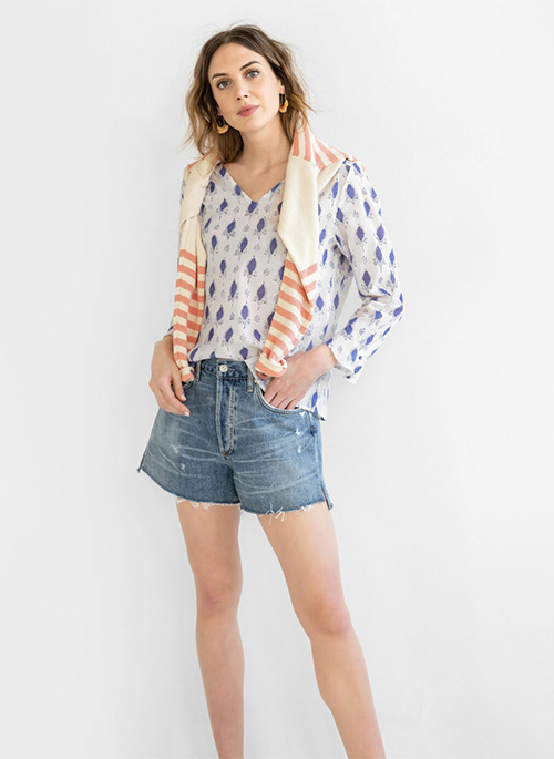 The blue and white Annelise has clean lines with modern details. Light as a feather this shirt is cool in the warmest of weather.
