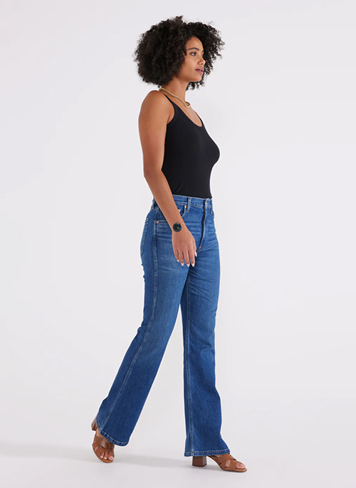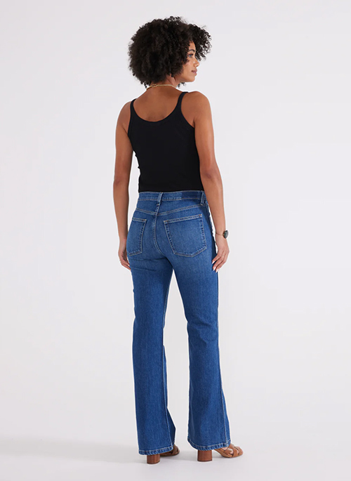 A modern flare with a slim fit and a gradual opening that finishes just past the ankle. A seasonless dark wash is finished with caballo seaming details for an authentic look.