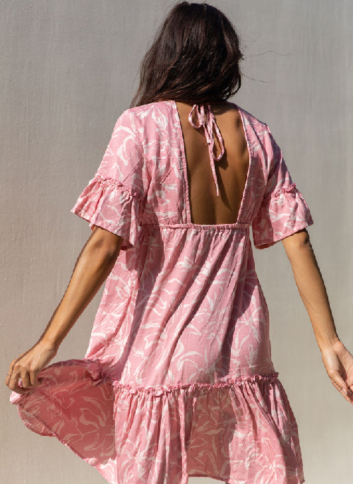 Feminine and flirty. The Ariana Dress features a v-neck with elastic under the bust, half-length flutter sleeves, a flutter hem, and an open back. This style is comfortable, feminine, and flirty.