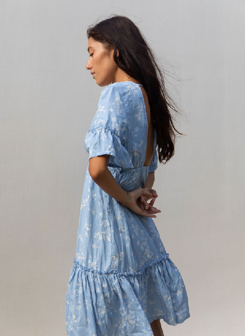 Feminine and flirty. The Ariana Dress features a v-neck with elastic under the bust, half-length flutter sleeves, a flutter hem, and an open back. This style is comfortable, feminine, and flirty.