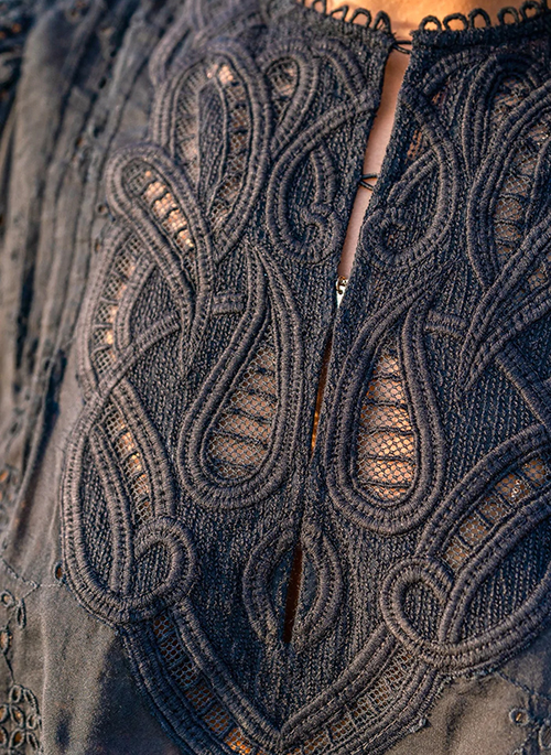 The embroidery is a reverse applique technique, where cotton mesh has been used as a second layer. Once the thread embroidery is done, the upper fabric layer is cut off to reveal the see-through mesh underneath, which creates the elevated and rather unique embroidery expression.