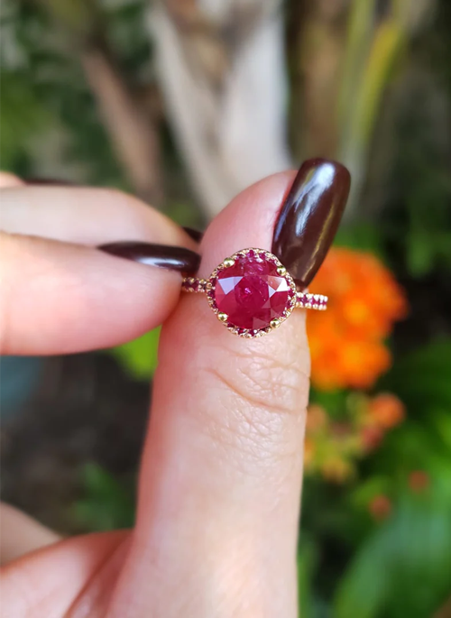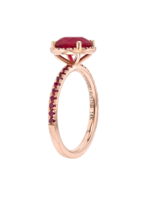 The Signature Astra ring created for a round brilliant shape genuine ruby. The halo and band have 0.25ctws in small round rubies with the center ruby weighing approximately 1.70ct.