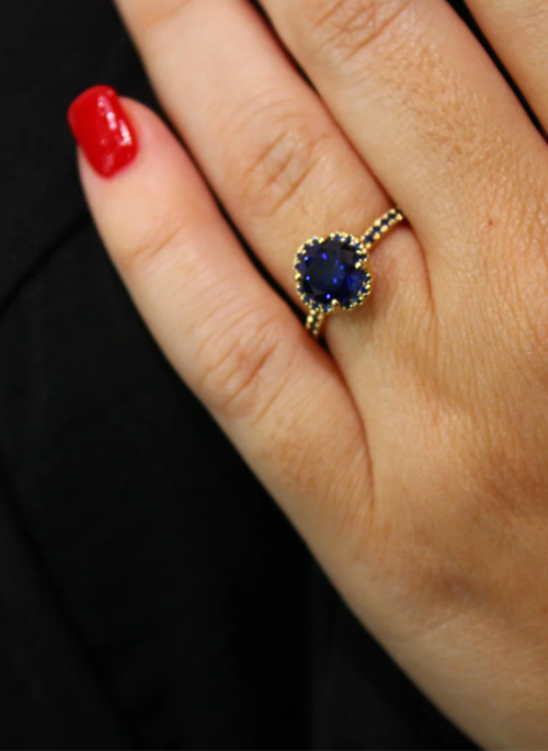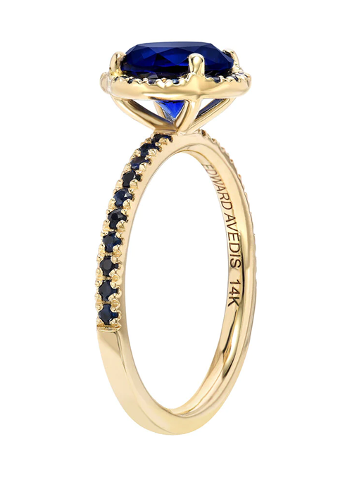 Signature Astra Halo created for a blue sapphire and sapphire halo. The ring is made in 18kt yellow gold.