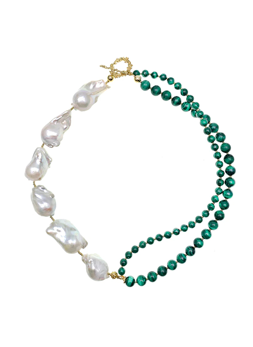 This handmade necklace features malachite with baroque pearls with Japan golden plated brass findings. It's beautiful and unique, pair it with dress, blouse or knitwear. Style it your way and bring joy to your everyday. Also, this is a very nice gift for birthday, anniversaries or festivals. It will be contained in a nice jewerlry box with well packed.