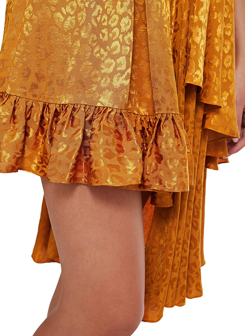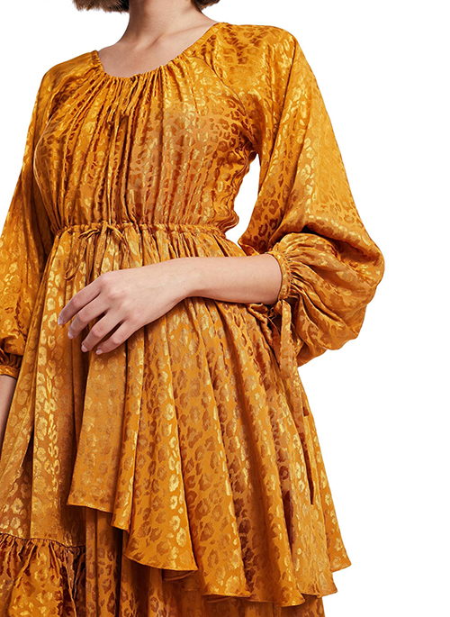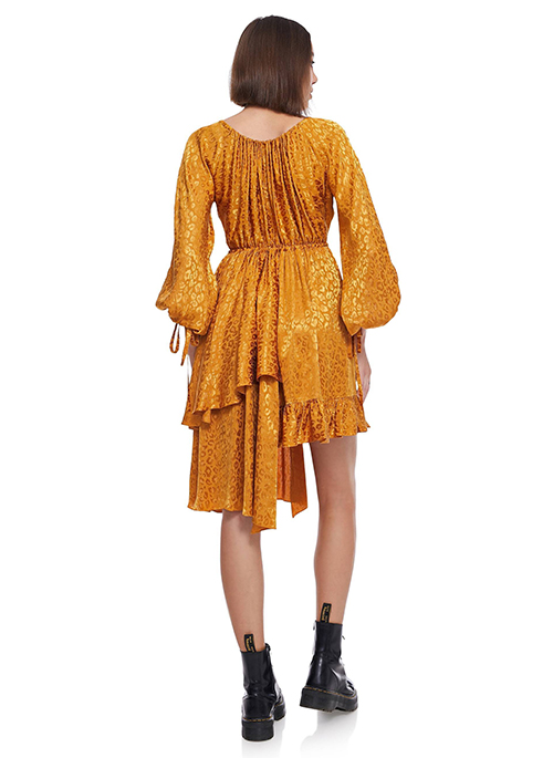 Yes, we want to wear this asymmetrical dress with long sleeves at any occasion this season and clearly in the next. It is a special dress with an asymmetrical wood built in beginnings, boho long sleeves or a high quality viscose fabric with jaquart silk in a beautiful mustard color. Wear this dress with boots or heels and in any dress you will look cool.