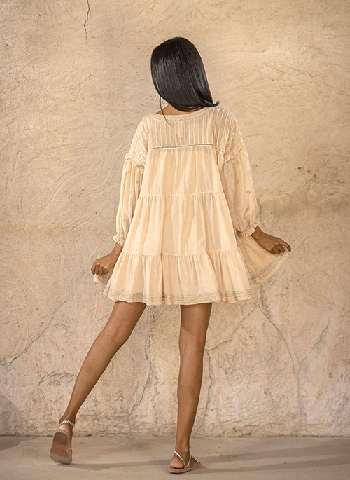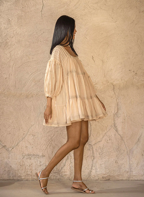 AURA FLORA is your everyday summer dress. Comfort first but never at the compromise of pretty details; there are many worth mentioning in this dress. From finest ladder laces and mindfully placed embroidery details, to pin tucks and small frills, this ¾ sleeve tiered dress is simply beautiful and easy to wear. Stitched from a premium cotton viscose voile blend. Comes with a detachable lining strap dress to maximise wearability.