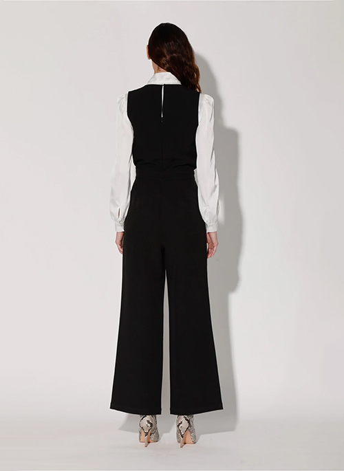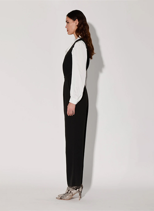 Sleek and sophisticated, the Ava Jumpsuit is a sleeveless V neck jumpsuit that is eye catching on its own, layered over a fitted turtle neck, or under one of our oversized leather blazers.
