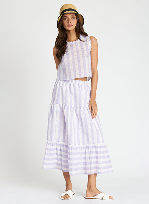 A classic shape perfected with subtle stylish detail; the high, elastic waist of the Maya Skirt sits comfortably at high hip while its tiered skirt creates an airy, flared form. Fanciful and feminine, pair this piece with the Aviana top for an effortless look of luxe.