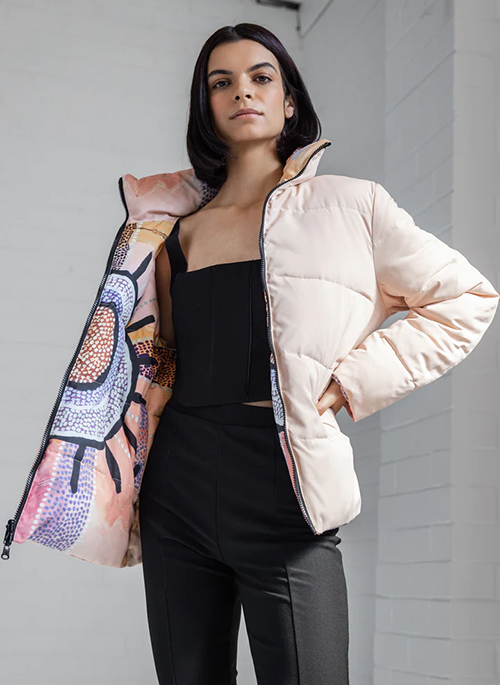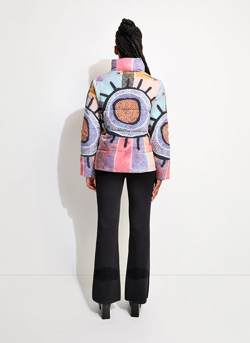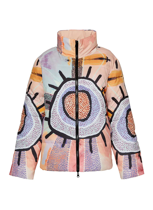 The Awari Jacket is constructed in a unisex puffer jacket silhouette and is defined by our bespoke Unreal Fur X Linda Puna digitally printed fabric. This style delivers a high-impact visual design, featuring the central patterns and objects of Linda Puna's celebrated painting, My Home.