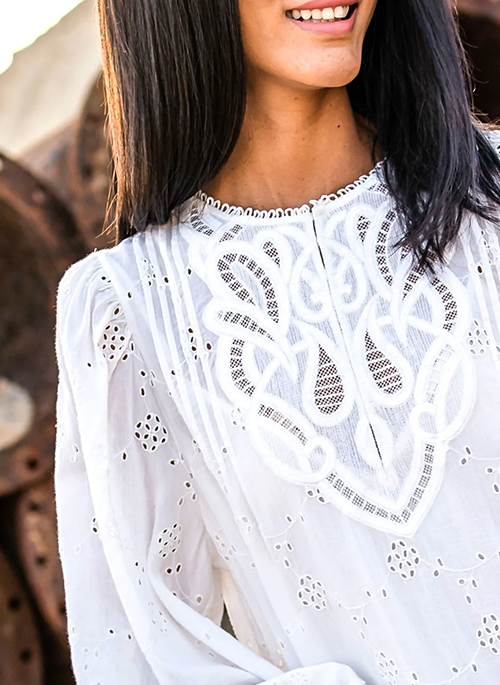The stunning yoke area is embroidered with a reverse applique technique, where cotton mesh has been used as a second layer. Once the thread embroidery is done, the upper fabric layer is cut off to reveal the see-through mesh underneath, which creates the elevated and rather unique embroidery expression.