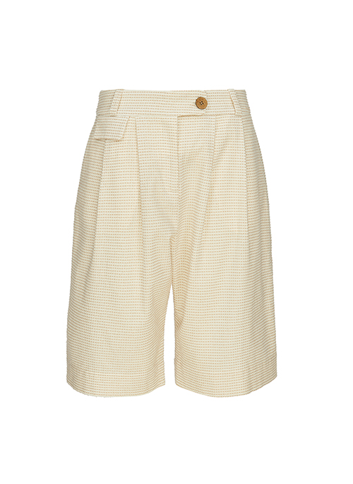 Bermuda-style knee-length shorts cut to sit high on the waist. The piece features pleats at the front to enhance the baggy fit, side pockets, and textured touch.