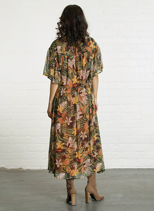 With its modest ruffled neckline, drop-shoulder detail with gathered sleeves and empire style waistline, this Baldwin maxi dress is both fanciful and feminine.