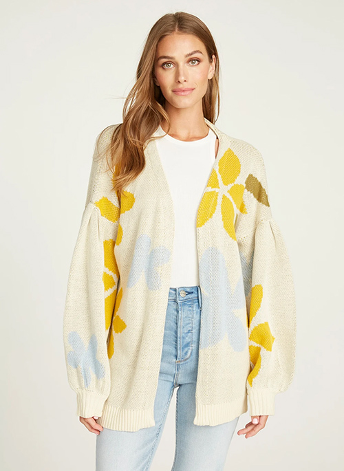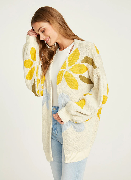 Level up your cardi collection. This sunshine-inspired cardi is an oversized, balloon sleeve-style silhouette in Ivory, with a bright floral print, dropped shoulders, and ribbed hem for added dimension.Details:
