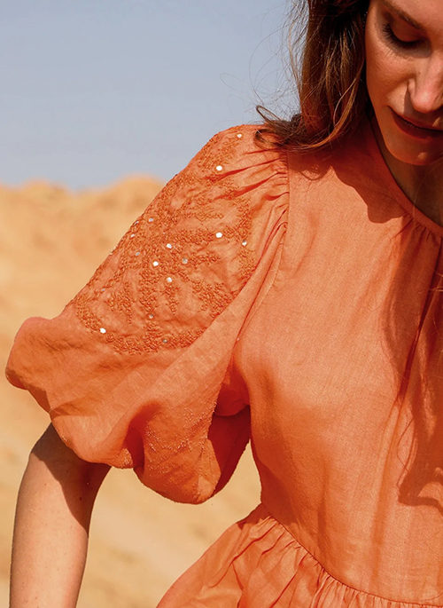 Puffy sleeves and mirror embroidery come together in this playful linen mini dress – your ultimate summer dress.