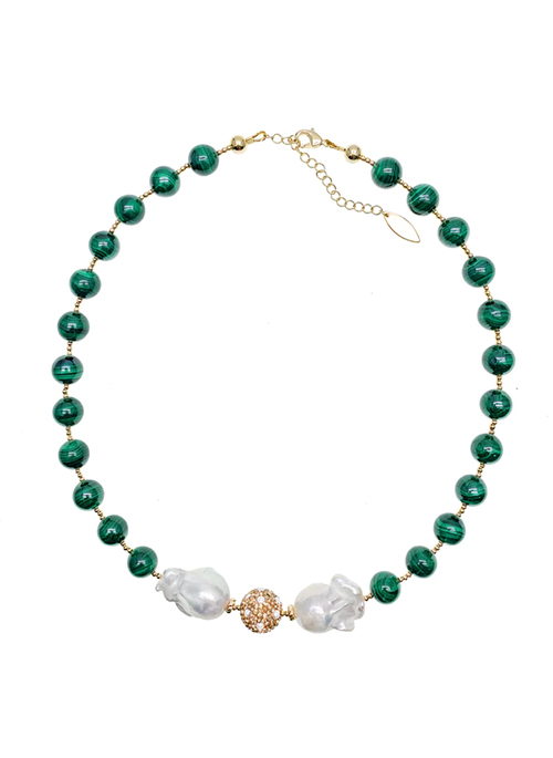 This handmade necklace is made of malachite with baroque with rhinestones bordered pearls and Japan golden plated brass findings. Beautiful craftsmanship and details which can be worn with dress, blouse or knitwear. Pair with Farra earrings with bracelet from day to night for any occasion. Also, this is a gorgeous gift for birthday, anniversaries or festivals. It will be contained in a nice jewerly box with well packed.