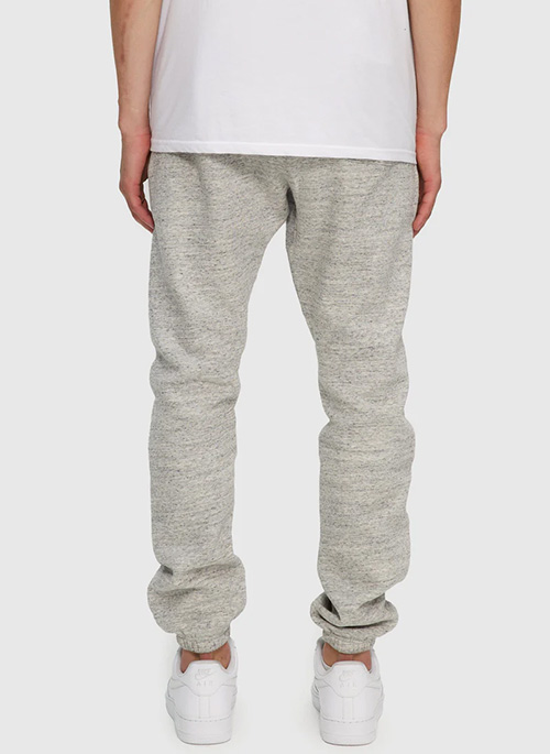 Our classic Baseline Sweatpant updated in Marled Fabric. Elastic & Drawstring waistband, elastic cuffs. Zippered welt-pockets at sides. Single Patch Pocket at rear. Gusset at crotch.Details: