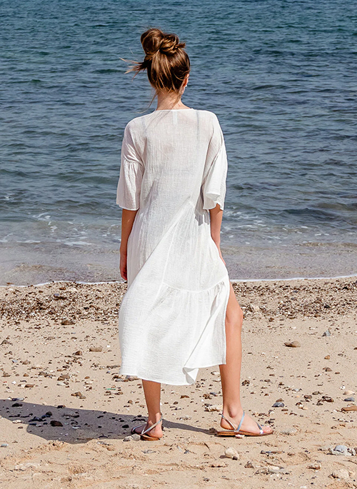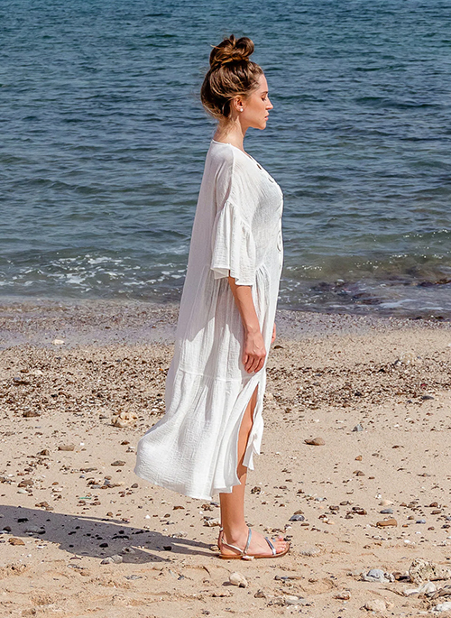 The name describes where this beautiful beach kaftan really prefers to be, and because it is so comfortable and easy to wear at any time of the day. Cut from a breezy fabric in a blend of cotton and linen, this dress has a decorative cotton crochet panel made by hand and the bell sleeve gives a feminine look.