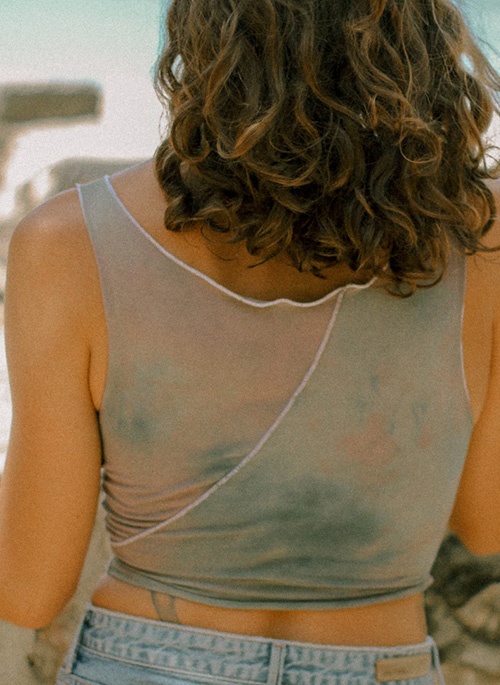 Hand dyed crop tank top in a distressed earth/jewel tone tie dye pattern. Sleeveless style featuring exposed asymmetrical seaming in a soft jersey knit fabric.