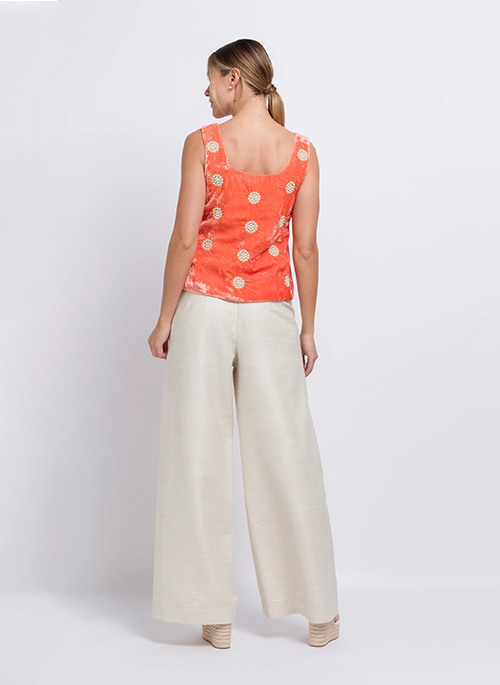 Wear this luxurious crushed velvet top with jeans for an elevated daytime look or our ruffle silk trousers for a special occasion. Hand-embellished with ivory demi pearls and light gold threadwork in repeat circular motifs, this piece is certain to be the wow factor whatever your occasion.